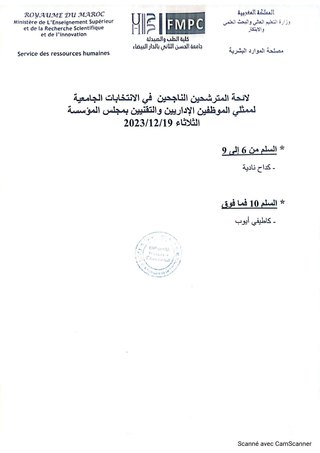 لائحة المترشحين الناجحين في الانتخابات الجامعية لممثلي الموظفين الإداريين والتقنيين في مجلس المؤسسة.
