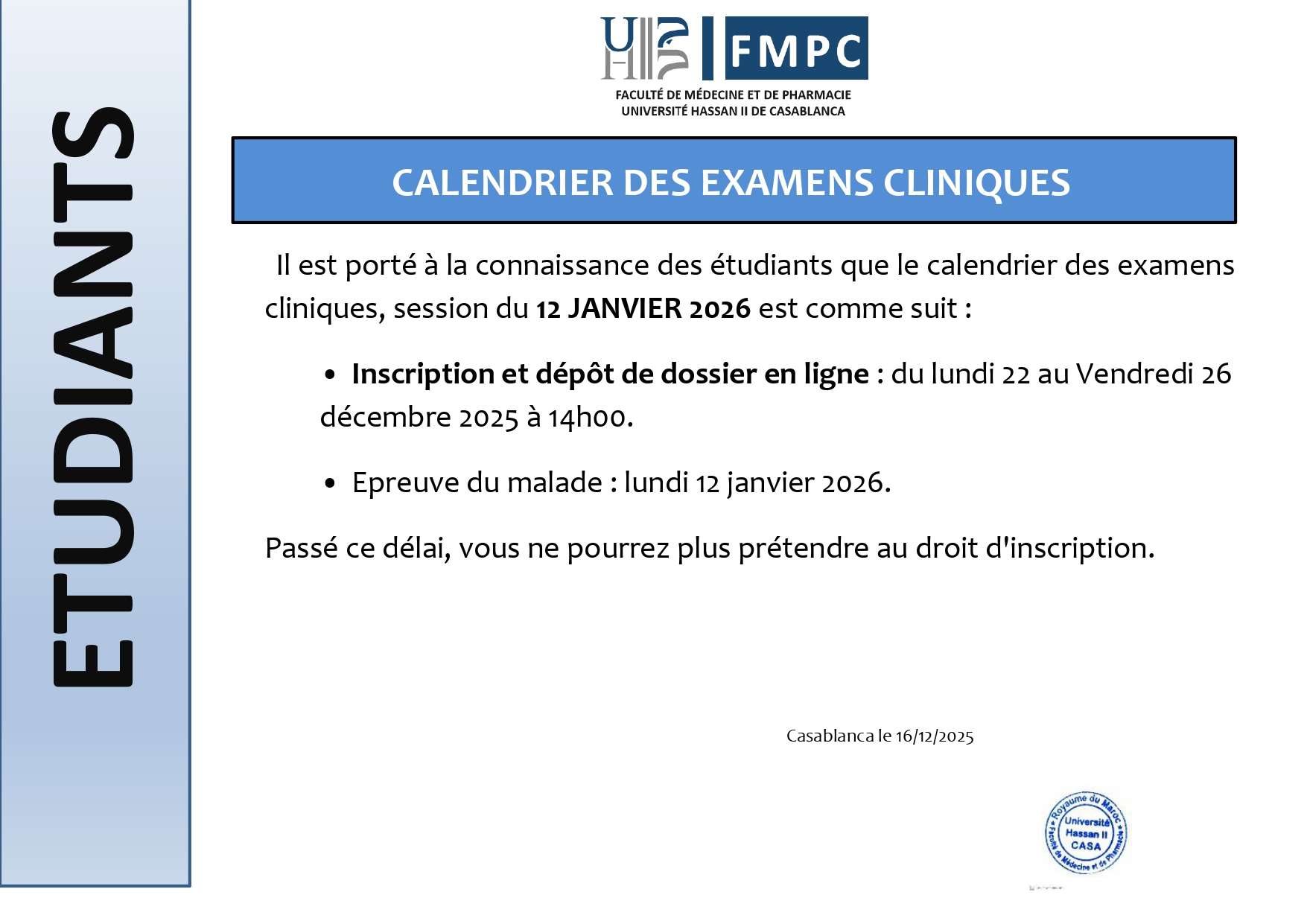 CALENDRIER DES EXAMENS CLINIQUES – SESSION 12 JANVIER 2026