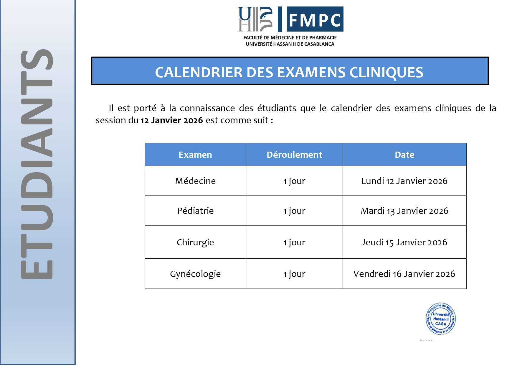 CALENDRIER DES EXAMENS CLINIQUES – SESSION DU 12 JANVIER 2026