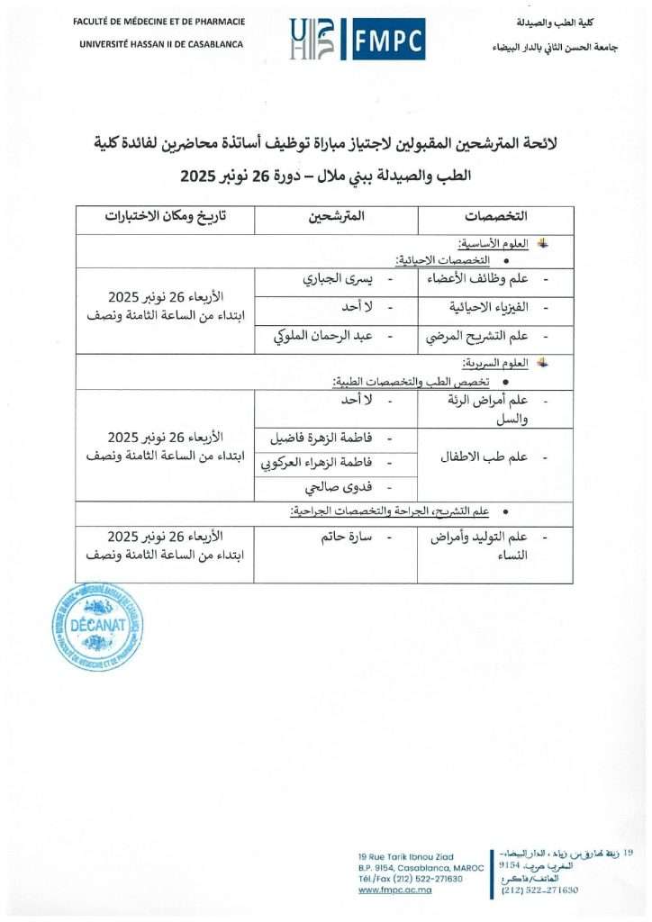 Liste des candidats autorisés à passer le concours de recrutement des Maîtres de Conférences, au profit de la Faculté de Médecine et de Pharmacie Beni Mellal: Session du 26 Novembre 2025