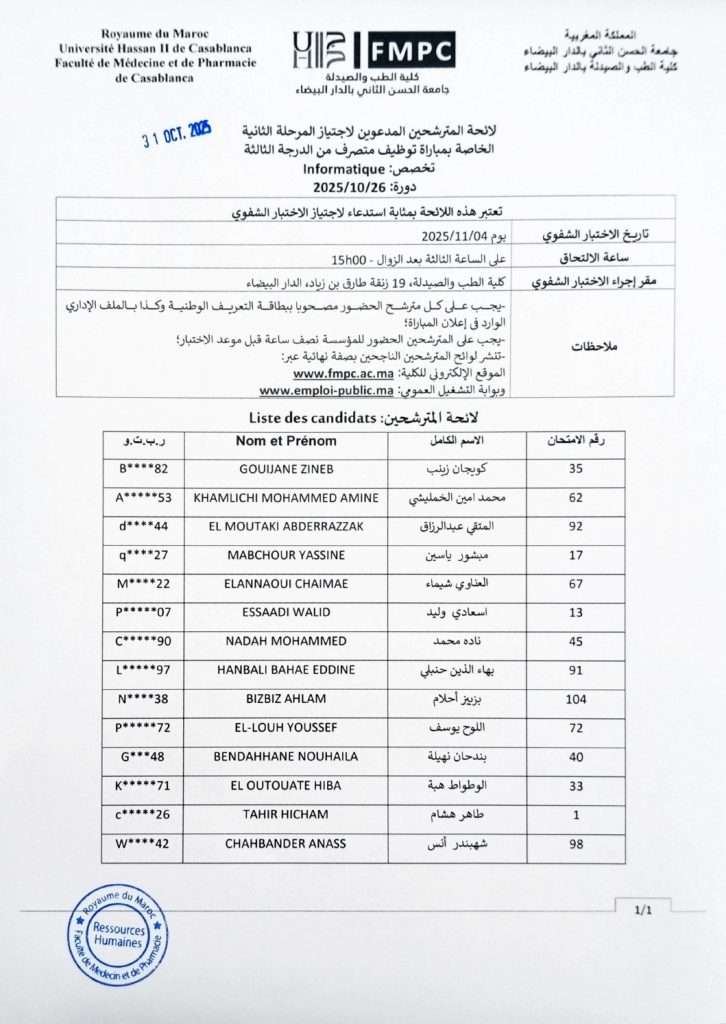 Liste des candidats convoqués à l’examen oral du concours de recrutement des administrateurs de 3ᵉ grade – Spécialité : Informatique – Session du 26 octobre 2025