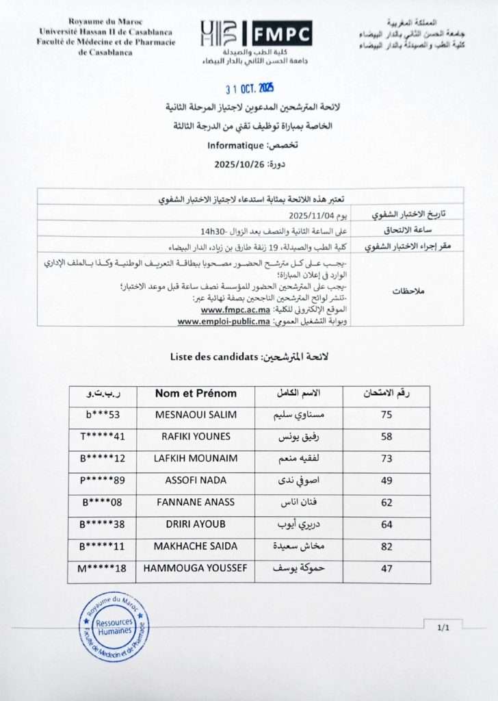 home>actualités>Liste des candidats convoqués à l’examen oral du concours de recrutement d’un technicien de 3ᵉ grade – Spécialité : Informatique – Session du 26 octobre 2025