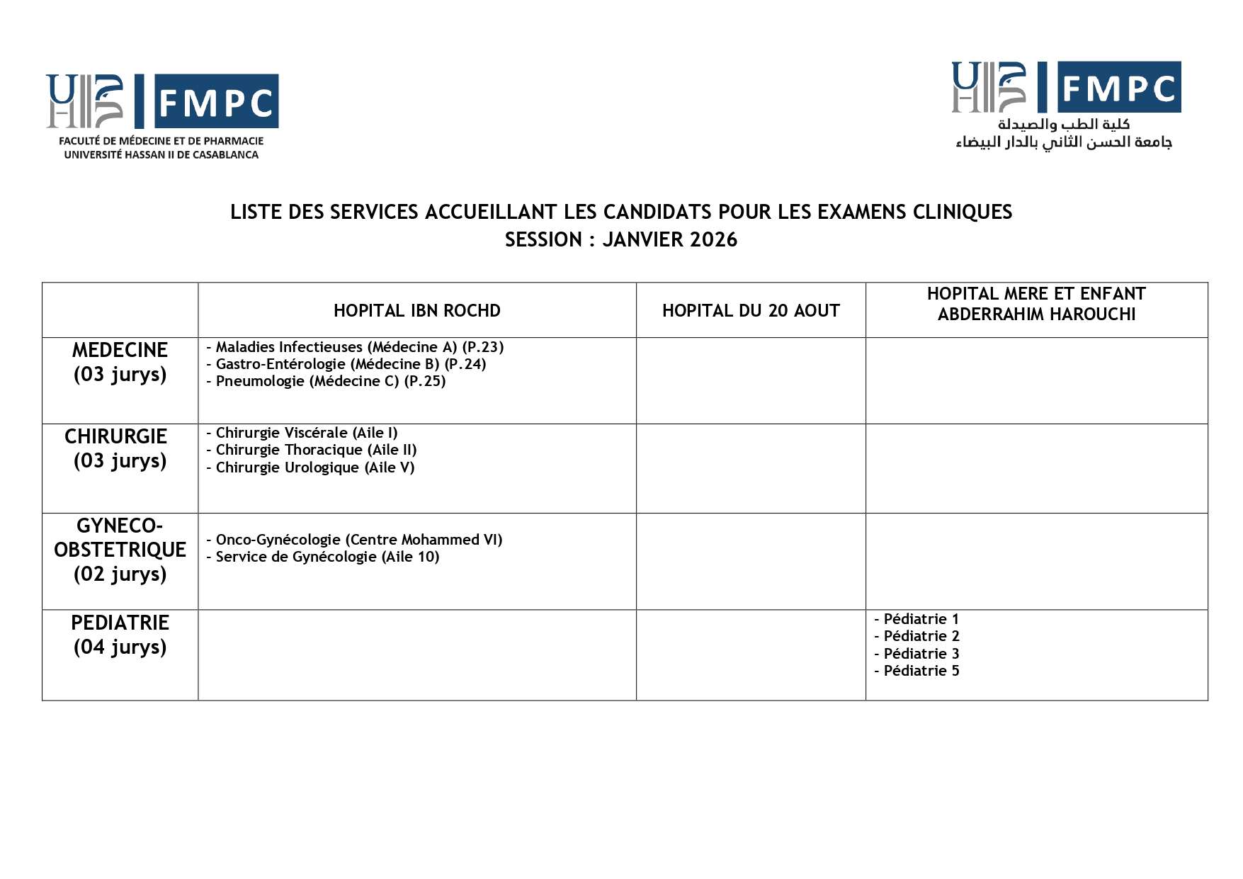 LISTE DES SERVICES ACCUEILLANT LES CANDIDATS POUR LES EXAMENS CLINIQUES SESSION : 12 JANVIER 2026