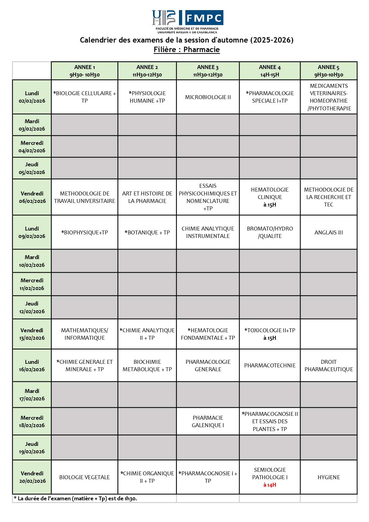 Pharmacie: Calendrier des examens de la Session d’automne (2025-2026)